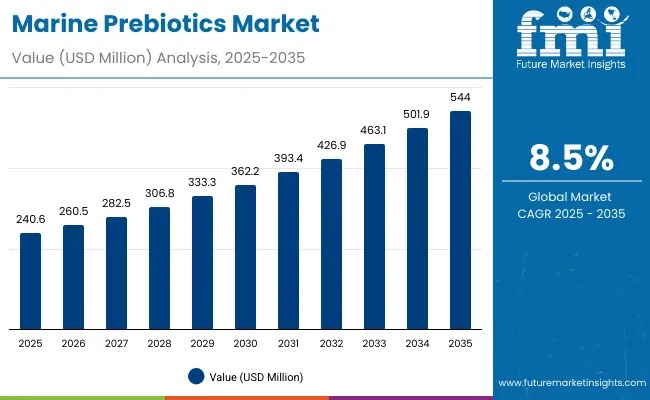 The global Marine Prebiotics Market is set for accelerated expansion, rising from USD 240.6 million in 2025 to nearly USD 544.0 million by 2035, reflecting an 8.5% CAGR. The decade is expected to generate a cumulative revenue gain of USD 264.9 million, positioning marine-derived prebiotics among the fastest-growing functional health ingredients globally.