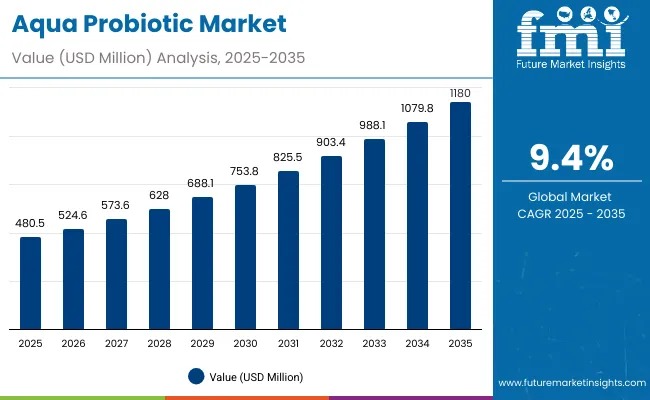 The global Aqua Probiotic Market, valued at USD 480.5 million in 2025, is projected to reach USD 1,180.0 million by 2035, reflecting a strong 9.4% CAGR. The decade is set to witness a structural shift as probiotics move from supplementary solutions to mainstream pillars in aquaculture health management.