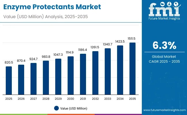 The global enzyme protectants market is projected to reach USD 1,511.5 million by 2035, rising from USD 820.5 million in 2025 and adding nearly USD 691 million in value over the decade. This growth trajectory reflects a steady CAGR of 6.3%, driven by the expanding use of enzymes in pharmaceuticals, diagnostics, food biotechnology and advanced bioprocessing.