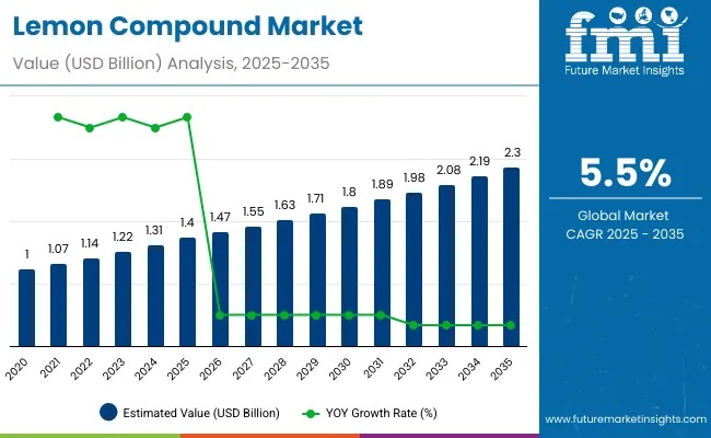 The global lemon compound market, valued at USD 1.4 billion in 2025, is projected to reach USD 2.3 billion by 2035, expanding at a steady CAGR of 5.5%. The long-term value accumulation curve indicates consistent year-over-year expansion, reflecting rising adoption across food, beverage, fragrance, and specialty chemical sectors. Market growth remains stable, supported by the demand for high-purity, natural citrus derivatives used for flavoring, aroma, and functional performance across multiple industries.
