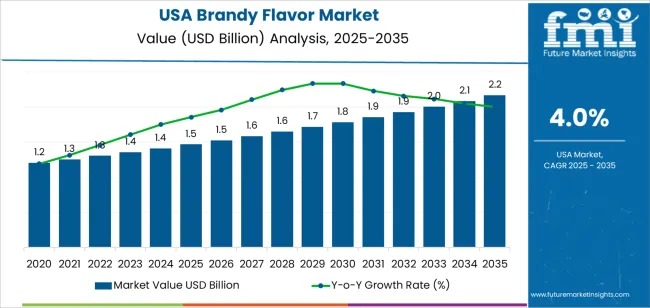 The demand for brandy flavor in the USA is projected to rise from USD 1.5 billion in 2025 to USD 2.2 billion by 2035, registering a steady CAGR of 4%. This growth is underpinned by the country’s evolving beverage landscape, where consumers increasingly prefer premium spirits, craft cocktails, and refined flavor profiles. Brandy flavor continues to stand out for its rich, complex character—making it a favored ingredient in alcoholic beverages, RTD cocktails, bakery formulations, and gourmet food applications.
