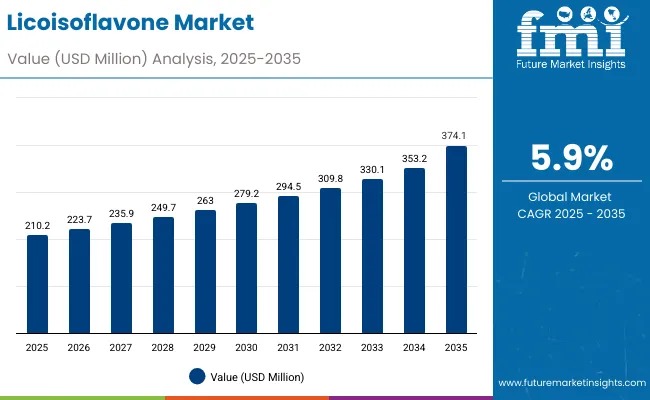 The global licoisoflavone market is on track to reach USD 374.1 million by 2035, rising from USD 210.2 million in 2025, driven by the rapid adoption of natural bioactive compounds across pharmaceuticals, nutraceuticals, and cosmetic formulations. The market is projected to grow at a 5.9% CAGR over 2025–2035, adding USD 163.9 million in new revenue opportunities.