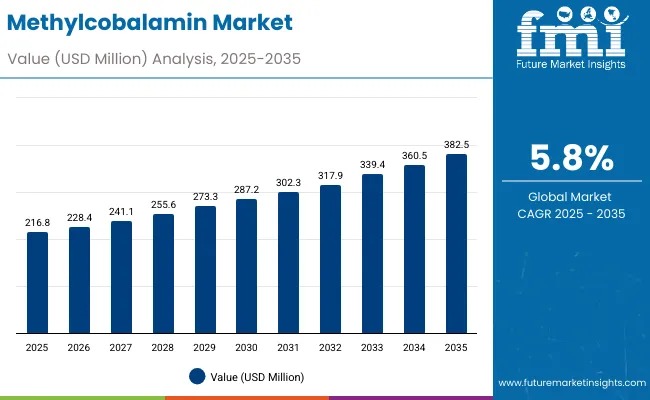 The global methylcobalamin market is on a steady upward trajectory, expected to reach USD 382.5 million by 2035, rising from USD 216.8 million in 2025 at a CAGR of 5.8%. The industry is witnessing accelerated adoption of bioactive vitamin B12 formulations, supported by rising neurological health awareness, expanding pharmaceutical applications, and a global push toward improved nutritional outcomes.