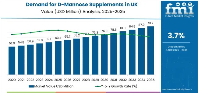 The United Kingdom’s D-mannose supplements market is on a steady upward trajectory, projected to rise from USD 63.4 million in 2025 to USD 91.2 million by 2035, marking a 3.7% CAGR. This growth—reflecting nearly 40% value expansion—is propelled by rising preference for natural health routines, preventive care habits, and strong consumer interest in science-backed supplementation. England continues to lead national uptake as digital-health adoption grows and wellness-conscious consumers shift toward cleaner, evidence-supported formulations.