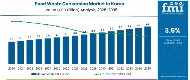 Sales of products derived from food waste in Korea are entering a steady expansion phase, supported by regulation-driven sustainability goals, advancing processing technologies, and rising demand for upcycled ingredients across food, feed, and non-food industries. The market is estimated at USD 2.1 billion in 2025 and is projected to reach USD 2.9 billion by 2035, reflecting a compound annual growth rate (CAGR) of approximately 3.5% over the forecast period.
