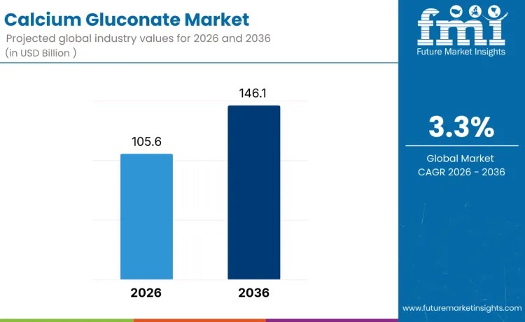 The global calcium gluconate market is entering a steady expansion phase as healthcare systems, food manufacturers, and nutraceutical brands increasingly prioritize safe, bioavailable calcium sources. Valued at USD 105.6 billion in 2026, the market is forecast to reach USD 146.1 billion by 2036, reflecting a consistent 3.3% compound annual growth rate. This growth trajectory mirrors rising calcium deficiency worldwide, greater awareness of bone and cardiovascular health, and expanding fortification initiatives across both developed and emerging economies.