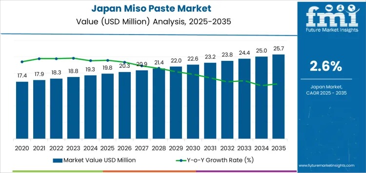The demand for miso paste in Japan is projected to rise from USD 19.8 million in 2025 to USD 25.7 million by 2035, reflecting a steady 2.6% CAGR over the forecast period. Starting from USD 17.4 million in 2021, the market has experienced gradual growth, underpinned by the consistent popularity of miso in traditional Japanese cuisine.