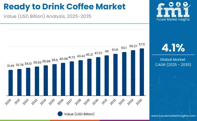 The global Ready-to-Drink (RTD) coffee market is witnessing steady growth, reflecting evolving consumer preferences for convenient, on-the-go beverages. Valued at USD 38.5 billion in 2025, the market is projected to reach USD 57.5 billion by 2035, registering a compound annual growth rate (CAGR) of 4.1%. Over the forecast period, the sector is expected to add an absolute dollar opportunity of USD 19.0 billion, demonstrating 1.49 times growth.