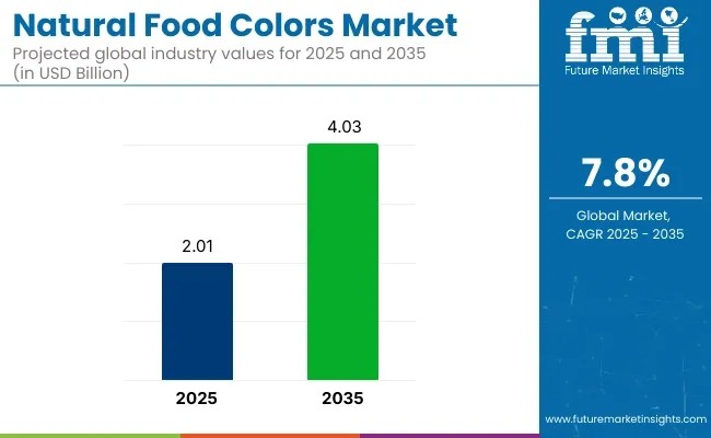 The global natural food colors market is entering a decisive growth phase as food manufacturers worldwide accelerate the shift away from synthetic dyes. Valued at USD 2.01 billion in 2025, the market is projected to nearly double to USD 4.03 billion by 2035, expanding at a compound annual growth rate (CAGR) of 7.2% over the forecast period. Rising consumer scrutiny of ingredient labels, the surge in plant-based and organic foods, and tightening regulations against petroleum-derived additives are collectively reshaping color formulation strategies across the food and beverage industry.