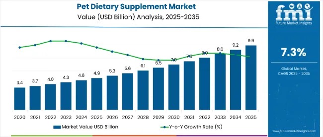 The global pet dietary supplement market is entering a decisive growth phase, underpinned by shifting pet care priorities and rising investments in preventive animal health. Valued at USD 4.9 billion in 2025, the market is projected to reach USD 9.9 billion by 2035, reflecting a strong compound annual growth rate (CAGR) of 7.3%. This near twofold expansion translates into an absolute dollar opportunity of USD 5.0 billion over the forecast period, highlighting the sector’s growing strategic importance within the broader pet wellness industry.