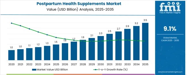 The global postpartum health supplements market is entering a decisive growth phase, underpinned by rising awareness of maternal nutrition and the increasing prioritization of postnatal recovery. Valued at USD 1.5 billion in 2025, the market is projected to more than double to USD 3.5 billion by 2035, expanding at a robust CAGR of 9%. This trajectory represents an absolute dollar opportunity of USD 2.0 billion over the decade, highlighting sustained demand across developed and emerging healthcare ecosystems.