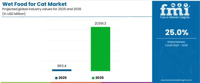 The global wet food for cat market is entering a phase of exceptional structural growth, driven by a deep shift in how consumers perceive feline nutrition. Valued at USD 863.4 million in 2025, the market is projected to surge to USD 21,591.3 million by 2035, expanding at a striking 25% CAGR. Over the next decade, wet cat food will transform from a supplementary feeding option into a central pillar of premium, wellness-led pet care.