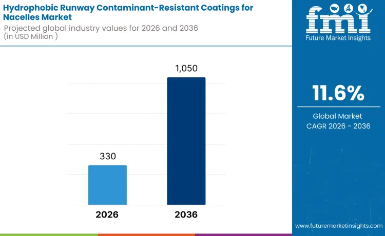The global hydrophobic runway contaminant-resistant coatings for nacelles market is entering a pivotal growth phase, with the industry valued at USD 330 million in 2026 and anticipated to surge to USD 1,050 million by 2036, driven by a robust CAGR of 11.6% over the forecast period. This dynamic expansion reflects aviation stakeholders’ growing emphasis on enhancing aircraft performance, reducing maintenance costs, and incorporating cutting-edge surface protection technologies across both established and emerging aviation hubs worldwide.