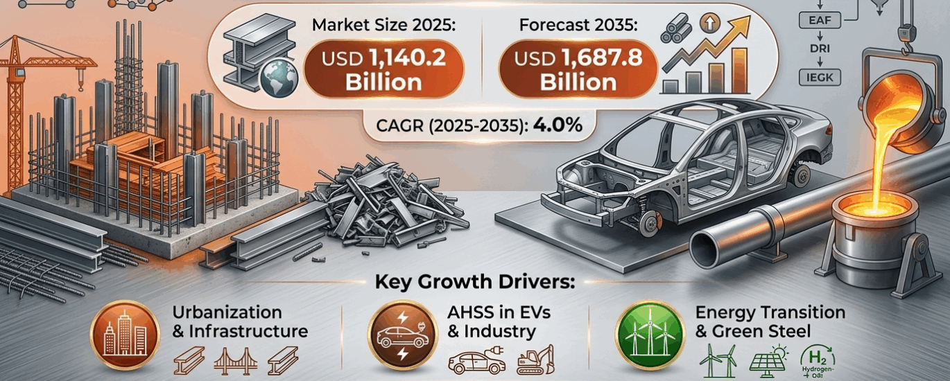The global carbon steel market is set for sustained expansion, projected to grow from USD 1,140.2 billion in 2025 to USD 1,687.8 billion by 2035, registering a steady CAGR of 4.0%. The market is expected to generate over USD 547.5 billion in new revenue, fueled by large-scale infrastructure investments, expanding manufacturing ecosystems, and rising adoption of advanced high-strength steel (AHSS) across automotive and industrial applications.