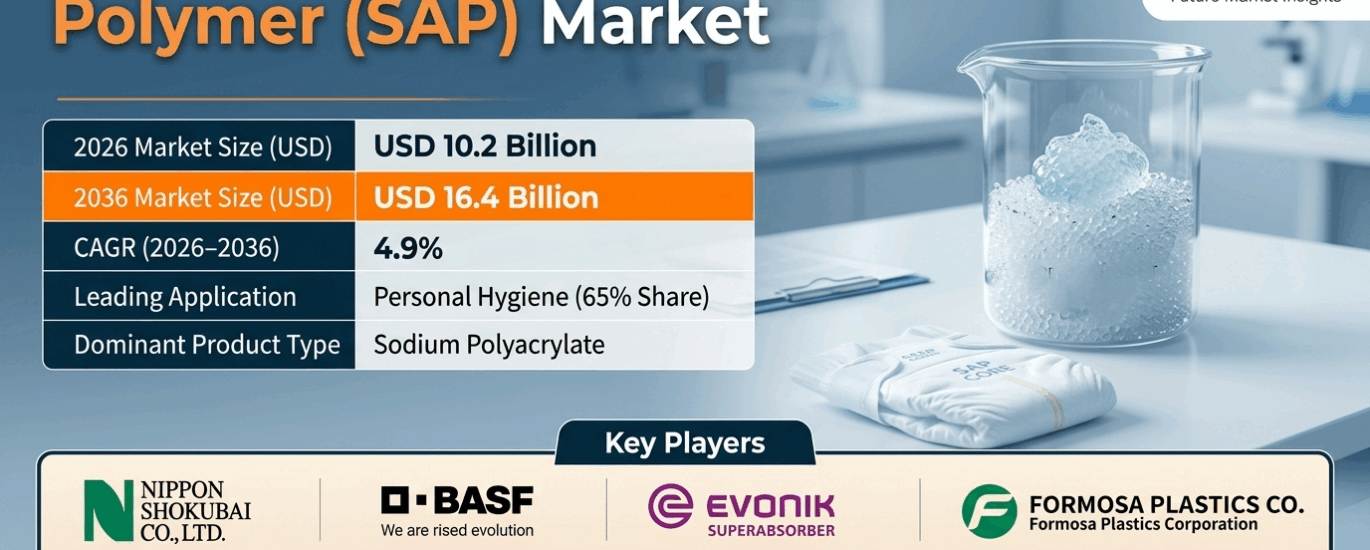 The global super absorbent polymer (SAP) market is entering a steady growth phase, projected to increase from USD 10.2 billion in 2026 to USD 16.4 billion by 2036, representing a CAGR of 4.9%, according to Future Market Insights (FMI). Growth is largely driven by rising diaper and hygiene product adoption in emerging markets, coupled with increasing demand for adult incontinence and agricultural water-retention solutions.