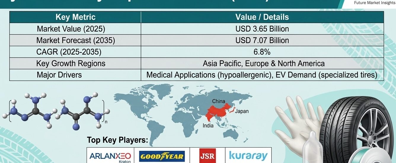 Key companies operating in the market include ARLANXEO, Kraton Corporation, The Goodyear Tire & Rubber Company, JSR Corporation, Kuraray Co., Ltd., Nizhnekamskneftekhim (NKNH), SIBUR, Cariflex, and Ansell Limited.