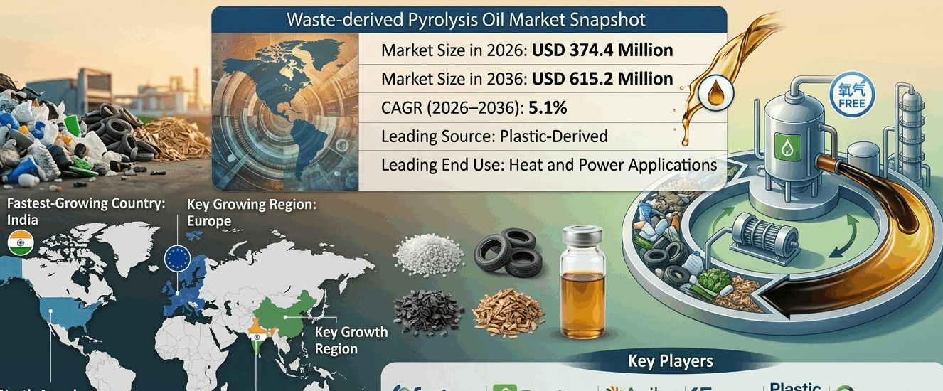 The global waste-derived pyrolysis oil market is projected to expand from USD 374.4 million in 2026 to USD 615.2 million by 2036, registering a CAGR of 5.1% over the forecast period. Growth is driven by increasing focus on waste-to-energy solutions, circular economy initiatives, and the need to reduce landfill dependency.