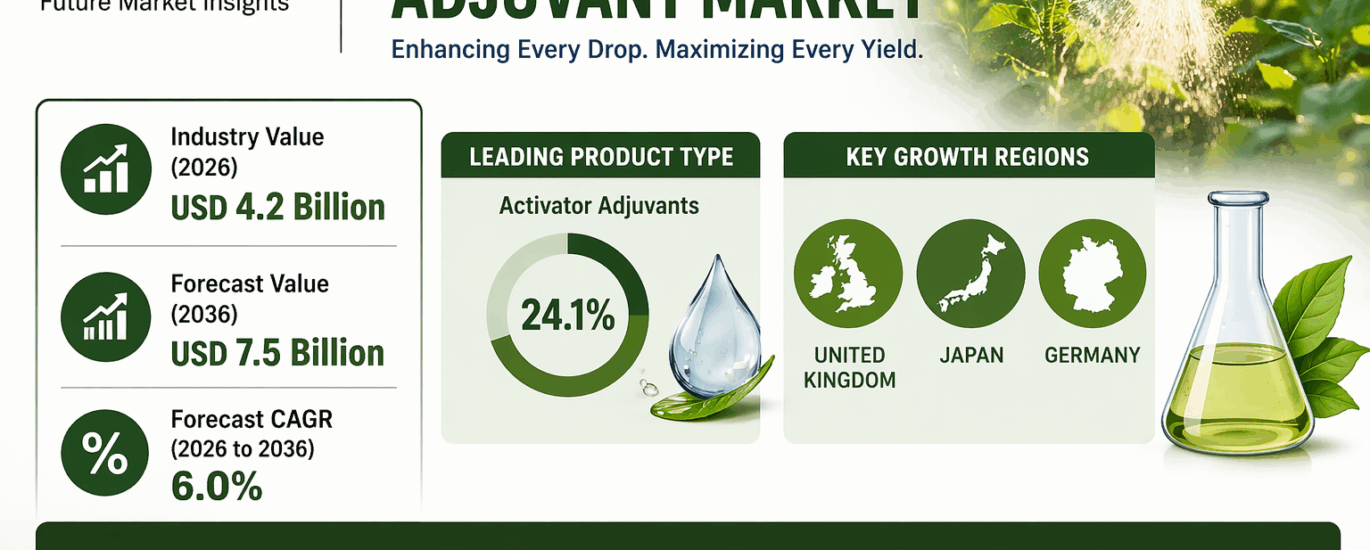 The global agricultural adjuvant market is projected to reach USD 4.2 billion in 2026 and expand beyond USD 7.5 billion by 2036, registering a CAGR of 6.0% during the forecast period. Growth is being driven by rising demand for spray efficiency, precision agriculture technologies, and stricter environmental regulations governing pesticide use. Agricultural adjuvants are increasingly used to improve wetting, spreading, retention, and penetration of crop protection products, helping farmers reduce waste while improving field performance.