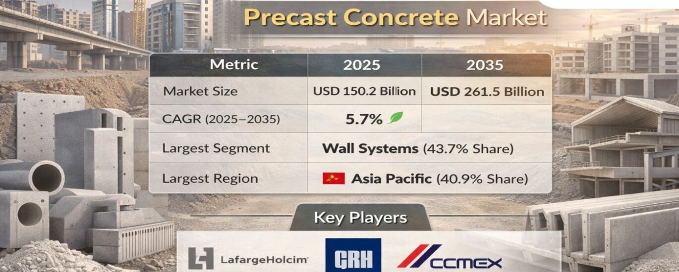 The global precast concrete market is witnessing steady expansion, driven by the growing need for efficient, durable, and sustainable construction solutions across residential, commercial, and infrastructure sectors. With the market projected to grow from USD 150.2 billion in 2025 to USD 261.5 billion by 2035 at a CAGR of 5.7%, precast concrete is rapidly transitioning from a traditional construction material into a strategic building system that supports modern construction demands.