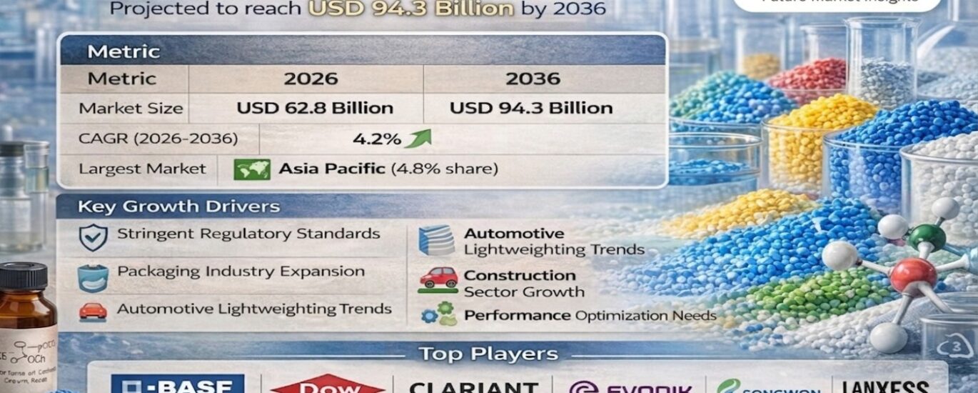 The plastic additive market is set to witness steady expansion, reaching USD 62.8 billion in 2026 and projected to grow to USD 94.3 billion by 2036, reflecting a CAGR of 4.2%. Growth is primarily driven by increasing demand for enhanced material performance across key industries such as packaging, automotive, and construction. Plastic additives play a critical role in modifying base polymer properties, enabling manufacturers to achieve desired characteristics such as flexibility, durability, thermal stability, and resistance to environmental factors.