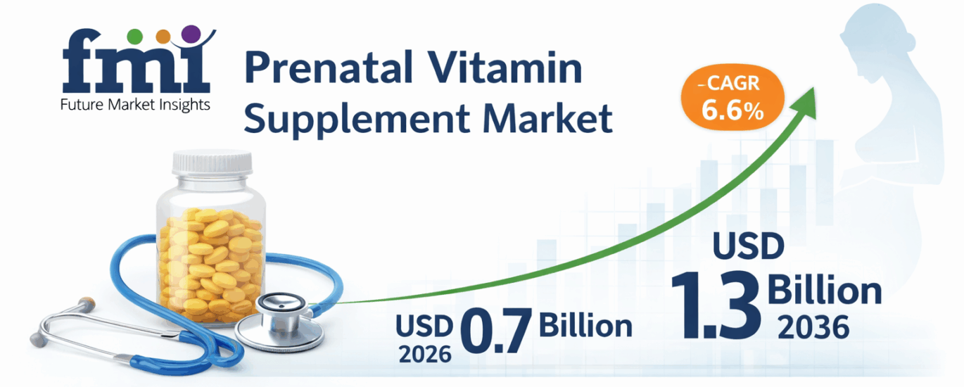 The global prenatal vitamin supplement market is projected to grow from USD 0.7 billion in 2026 to USD 1.3 billion by 2036, registering a CAGR of 6.6% during the forecast period. Growth is being driven by increasing awareness of maternal health, rising focus on personalized nutrition, and growing concerns regarding nutrient deficiencies during pregnancy. The demand for scientifically formulated prenatal supplements is rising as healthcare systems and consumers prioritize improved maternal and fetal outcomes.