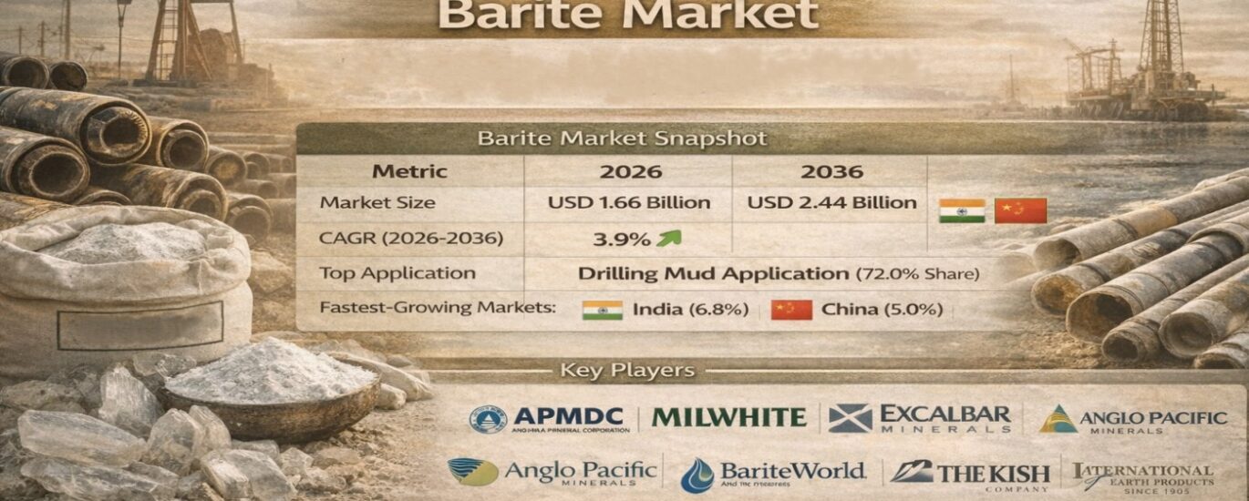 The global barite market is entering a phase of stable, demand-driven expansion, underpinned by its indispensable role in energy drilling and diversified industrial applications. Valued at USD 1.66 billion in 2026, the market is projected to reach USD 2.44 billion by 2036, growing at a CAGR of 3.9% over the forecast period.