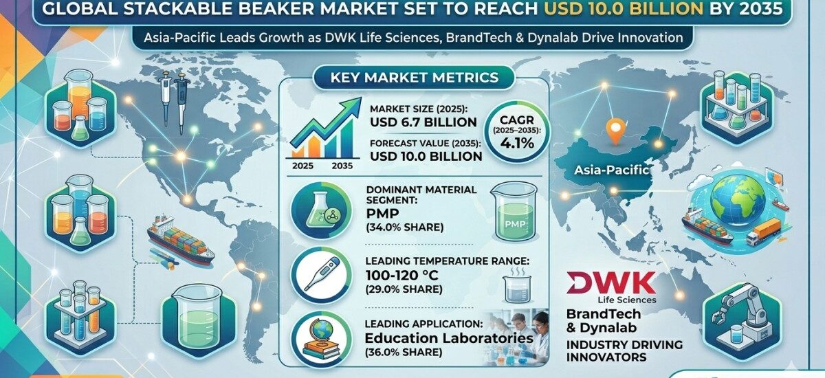The global stackable beaker market is projected to grow steadily from USD 6.7 billion in 2025 to USD 10.0 billion by 2035, registering a CAGR of 4.1% during the forecast period. This growth is primarily driven by increasing demand for space-efficient, durable, and reusable laboratory equipment across educational institutions, research facilities, and industrial laboratories.