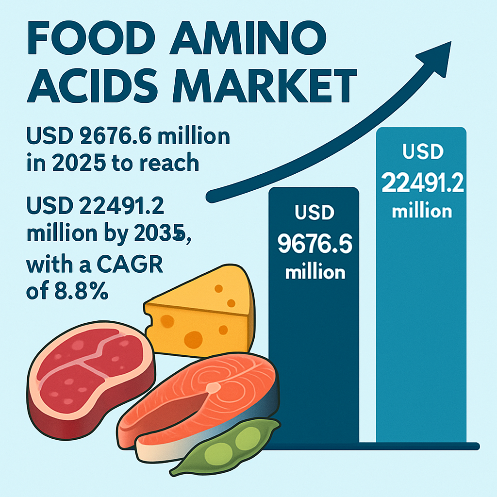 The Food Amino Acids Market is poised for substantial growth, projected to expand from USD 9,676.6 million in 2025 to USD 22,491.2 million by 2035, registering a robust CAGR of 8.8%. Driven by increasing health awareness, a shift toward plant-based and high-protein diets, and growing demand for fortified and functional foods, amino acids are becoming essential components in modern food formulations. The market is also benefitting from advancements in fermentation technologies and broader applications across dietary supplements and flavor-enhanced products.