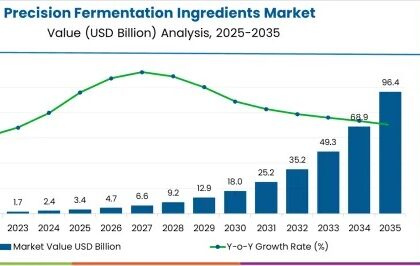 The global precision fermentation ingredients market, valued at USD 3.4 billion in 2025, is set